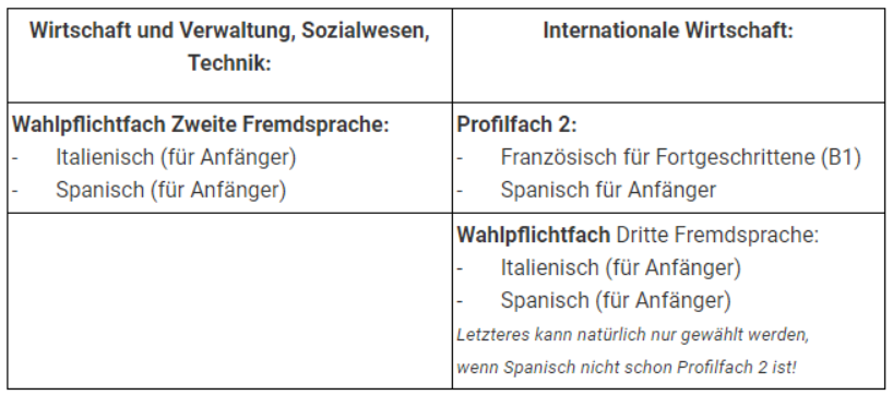 Während an den Anfängerkursen nur teilnehmen darf, wer in der entsprechenden Fremdsprache noch keine Kenntnisse auf GER-Niveau B1 nachweisen kann (Niveau B1 hat man normalerweise nach vier Jahren Pflichtunterricht, die mit Note 4 oder besser bestanden wurden), steigt der Französischkurs in der Ausbildungsrichtung Internationale Wirtschaft auf GER-Niveau B1 ein und baut auf den entsprechenden Kenntnissen auf!