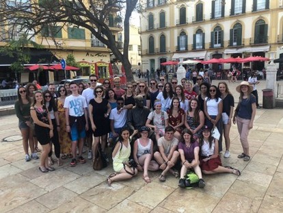 Die erste Panik ist vorbei. Jeder hatte es mehr oder weniger pünktlich zum Flughafen geschafft. Frau Kohlmaier hatte sicherheitshalber ihren Mann als externen Organisator dabei, der uns, als einzige Begleitperson über 1,70m gut sichtbar, durch den Flughafen schleuste. Danach waren wir mit unseren drei Lehrern auf uns gestellt. Was aber kein Problem war, denn hören kann man Frau Kohlmaier immer sehr gut. So gut, dass sie im Flugzeug die einzige war, die von einem anderen Fluggast zurechtgewiesen werden musste... Der restliche Flug verging so ereignislos, dass sogar die „Erstflieger“ bald eingeschlafen waren. In Málaga angekommen, wurden wir zur Sprachschule gebracht, wo unsere Gastfamilien uns abholten. Den restlichen Tag durften wir selbständig gestalten - die Ergebnisse sind auf Instagram zu bewundern.