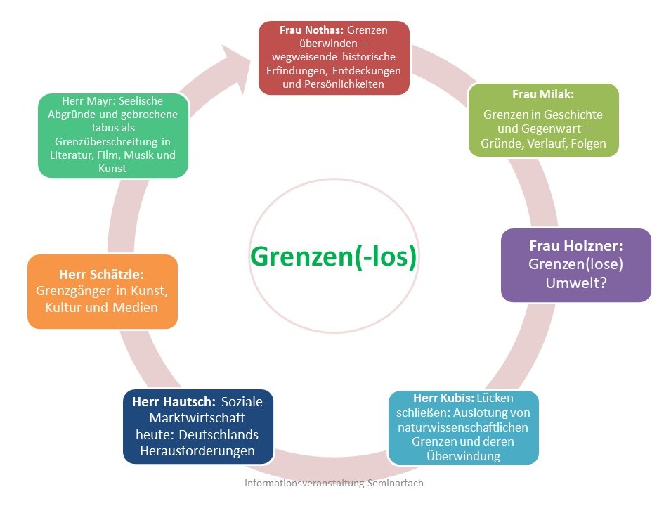 Im Schuljahr 2023/24 hat sich das Seminarfach der 13. Klasse an der FOS Holzkirchen dem aktuellen Rahmenthema „Grenzen(-los)“ verschrieben. Dieses sehr komplexe und breite Themengebiet wird in folgenden Seminargruppen aufgegriffen und differenziert betrachtet: