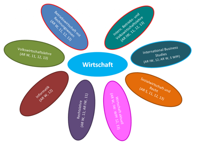 - Wirtschaft und Verwaltung in den Fächern Betriebswirtschaftslehre mit Rechnungswesen (Abschlussprüfungsfach am Ende der 12. und der 13. Klasse), Volkswirtschaftslehre, Rechtslehre und Informatik,